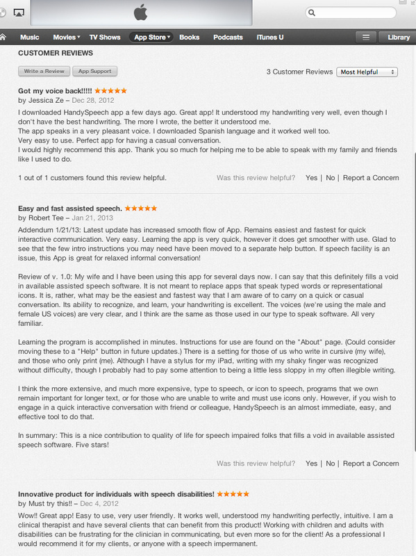 "My wife and I have been using this app for several days now. I can say that this application fills a void in available speech software. It is what maybe is the easiest and fastest way to carry on a quick or casual conversation. The application's ability to recognize and learn your handwriting is excellent. This is a nice contribution to the quality of life for speech impaired folks," said Robert T., a HandySpeech user.